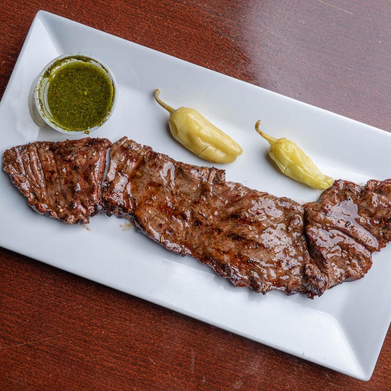 Choice cut, house marinated skirt steak with rosemary rub, served with chimichuri sauce.