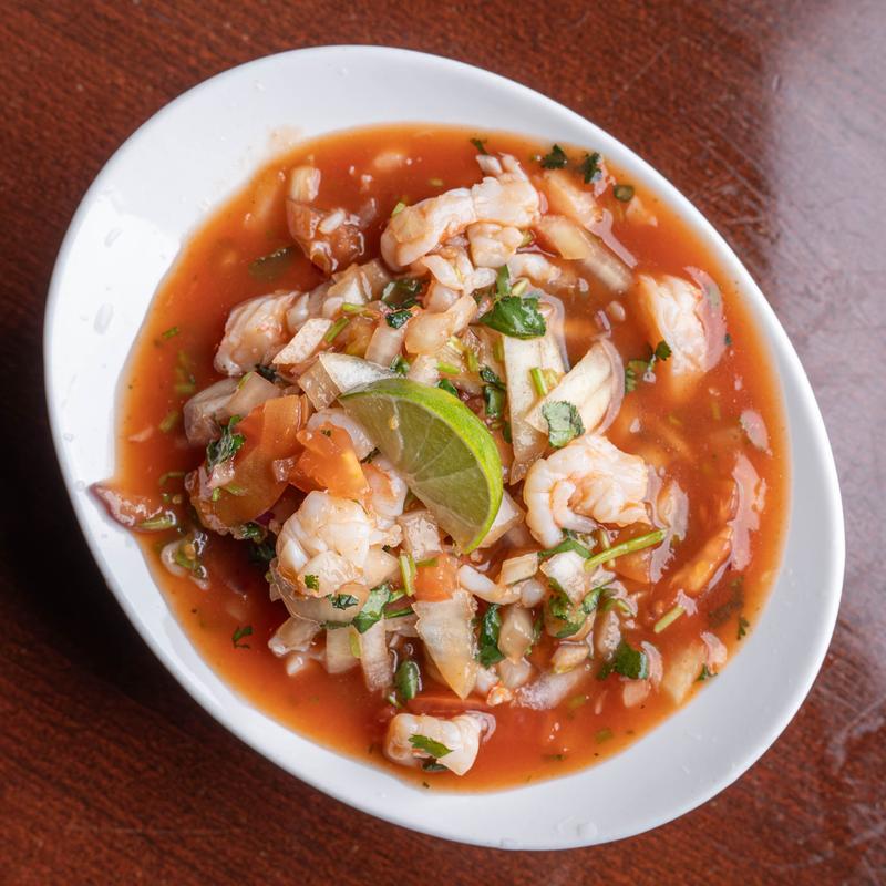 Tender shrimp served in our house seafood broth with bay leaves, parsley, cilantro, green olives, and rice.